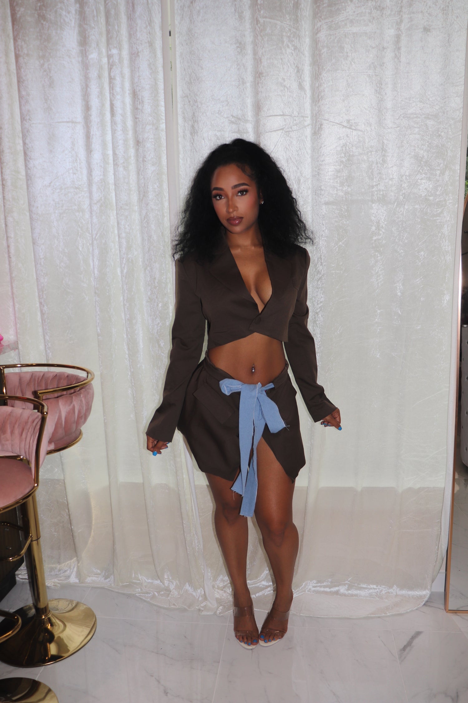 This two-piece set is a bold, fashion-forward look featuring a cropped blazer-style top and a matching mini skirt with a statement denim-inspired tie belt. The rich color adds a luxe touch, while the light blue tie detail gives it a playful contrast. Designed with a slightly oversized fit, the blazer brings a structured yet relaxed vibe, making it effortlessly chic. The material feels high quality and soft against the skin, offering both comfort and style. Whether you’re dressing it up for a night out or making a statement during the day, this set is a standout piece that’s as versatile as it is eye-catching. Model is wearing a small.